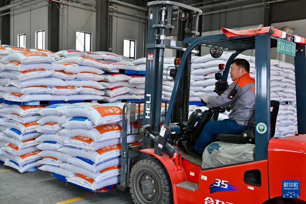 4月24日,在位于遼陽市的遼寧鑫金科技實業集團有限公司的飼料廠內,工人使用叉車搬運飼料。