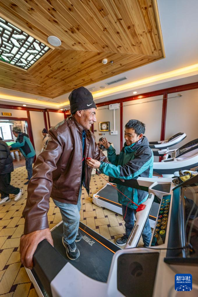 4月25日,在那曲市色尼區老年人日間照料中心,工作人員陪同老人在跑步機上做運動。