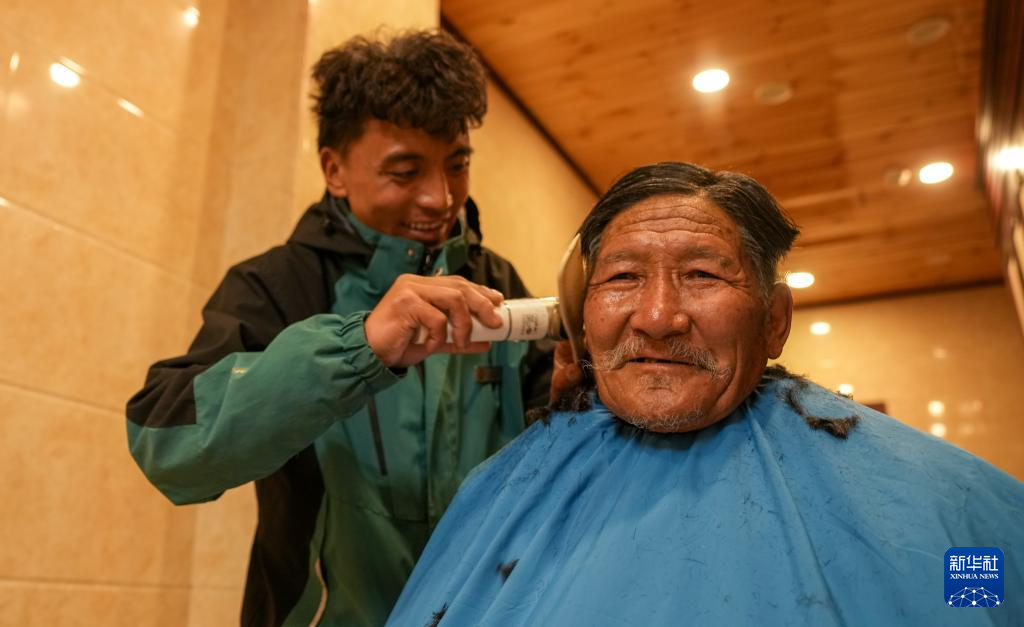 4月25日,那曲市色尼區老年人日間照料中心的工作人員為老人理發。