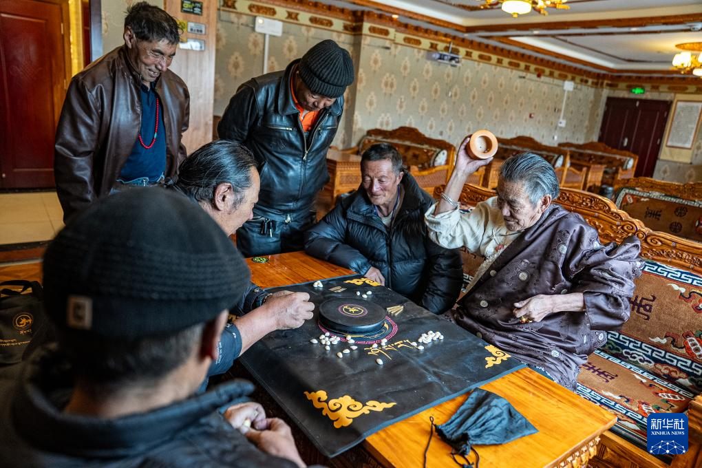 4月25日,老人們在那曲市色尼區老年人日間照料中心玩藏式骰子。
