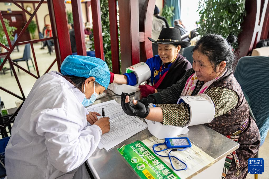 4月25日,在那曲市色尼區老年人日間照料中心,老人在測量血壓。