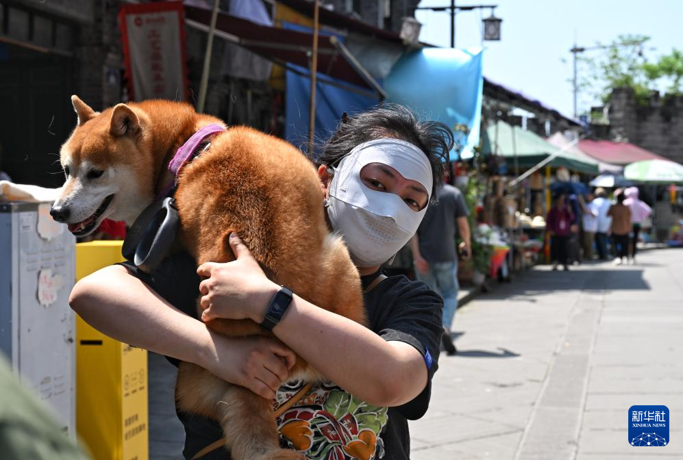 4月20日是二十四節氣的谷雨,重慶市最高氣溫達到34攝氏度。在榮昌區萬靈古鎮,主人擔心路面太燙,抱著寵物犬在街面行走。