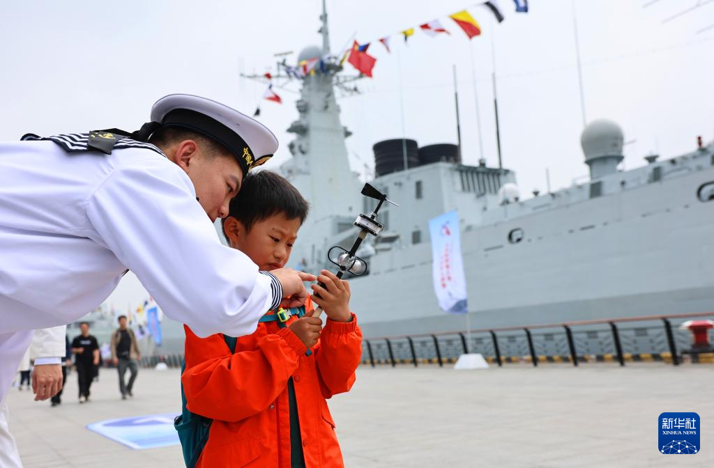 4月22日,一個小朋友在海軍戰士指導下體驗使用三杯風向風速儀。當日,在人民海軍成立76周年之際,駐滬海軍部隊聯合上海市雙擁辦共同組織以“上?!ずI稀睘橹黝}的艦艇開放活動。