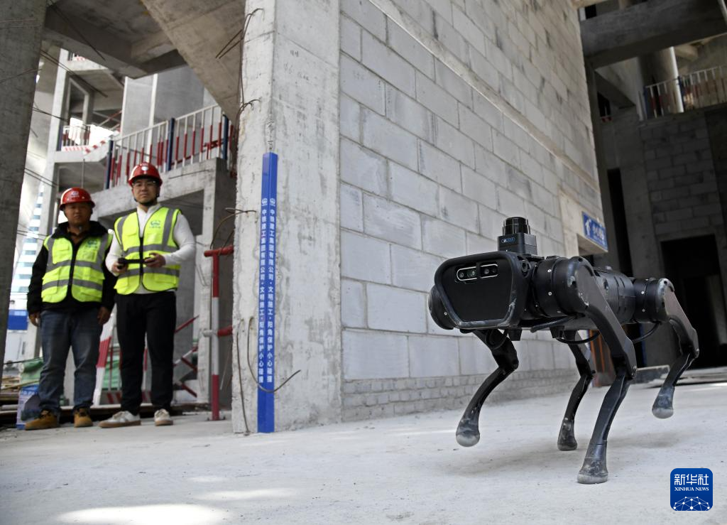 4月23日,青島市市南區南京路1號項目的工作人員在進行機器狗安全巡檢演示。當日,中鐵建工青島一建筑工地組織建設者們走進南京路1號項目,通過人工智能科技宣講、AI建筑應用演示、VR沉浸式體驗等形式,讓參觀者體驗人工智能等新技術在建筑領域的應用成果。
