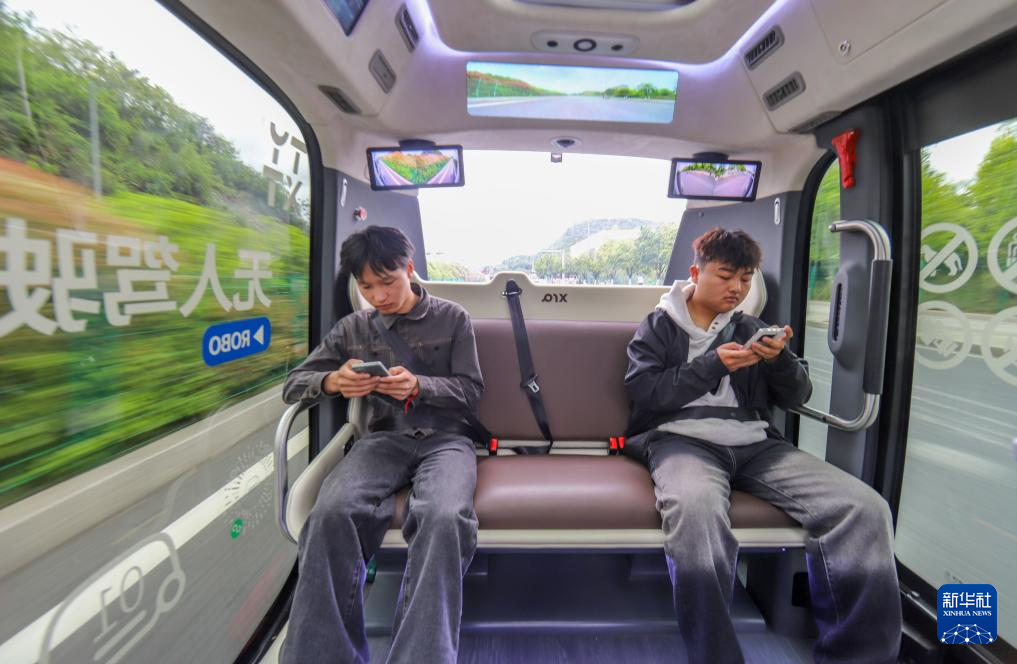 4月24日,參與體驗活動的市民在貴陽市花溪大學城試乘無人駕駛公交車。