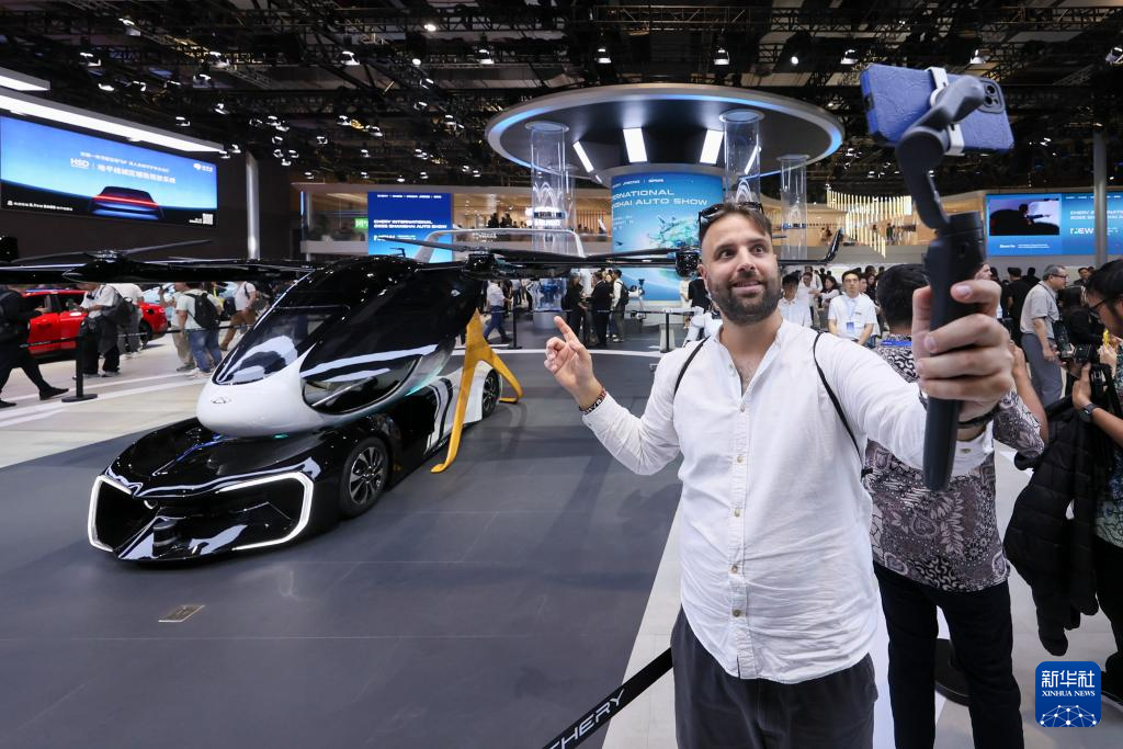 4月23日,參觀者在奇瑞飛行汽車前進行直播。當日,以“擁抱創新 共贏未來”為主題的第二十一屆上海國際汽車工業展覽會在國家會展中心(上海)拉開帷幕。