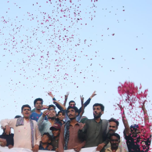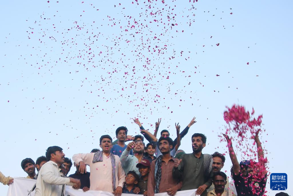 5月10日,在巴基斯坦東部旁遮普省木爾坦市,人們在巴基斯坦和印度宣布?;鸷髴c祝。