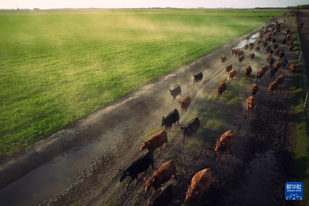 5月14日,牛群在阿根廷潘帕斯草原上一處農場內奔跑(無人機照片)。