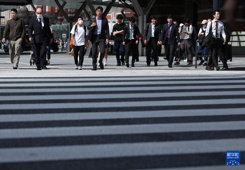 5月15日,在日本東京,行人通過東京站附近的一處人行橫道。