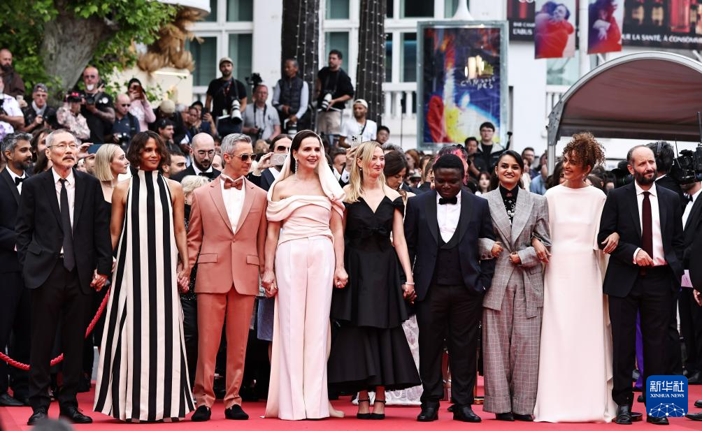 5月13日,在法國戛納舉行的第78屆戛納國際電影節上,主競賽單元評委會主席朱麗葉·比諾什(前排左四)攜眾評委亮相開幕式紅毯。
