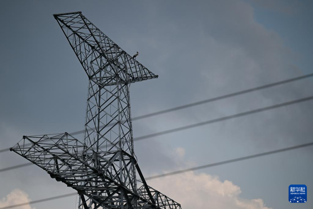 5月20日,在安徽省六安市霍邱縣,一只東方白鸛在輸電塔上棲息。
