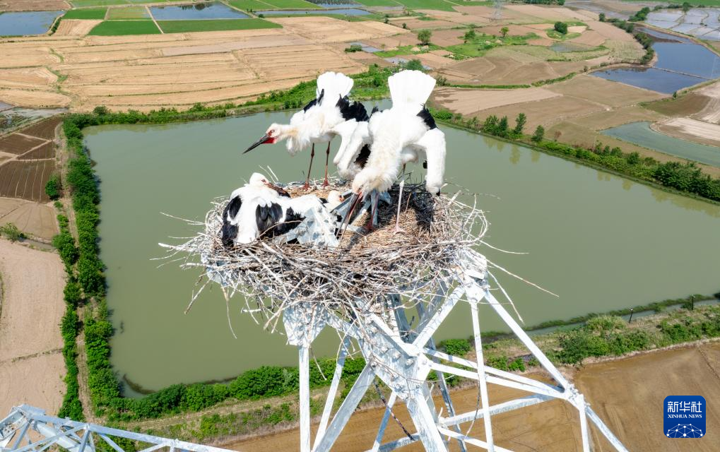 5月初,在安徽省六安市霍邱縣陜北至安徽±800千伏特高壓直流輸電工程皖2標段工地上,工作人員在新建的輸電塔上發現一個鳥巢。經確認,在此生活的正是國家一級保護動物——東方白鸛“一家”。