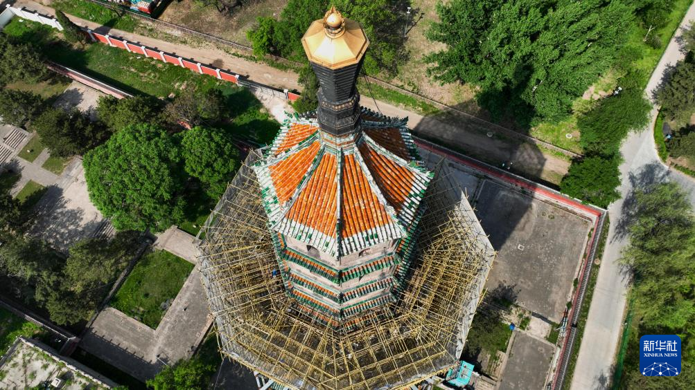 這是5月20日拍攝的承德避暑山莊舍利塔修繕施工現場(無人機照片)。