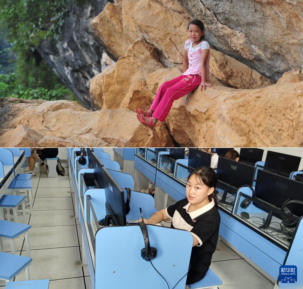 拼版照片:上圖為2012年9月5日,11歲的蒙秋艷在在廣西大化瑤族自治縣板升鄉弄雷村哈寶屯的懸崖邊休息(新華社記者黃孝邦攝);下圖為2022年9月5日,蒙秋艷在廣西醫科大學語音室學習(新華社發 韋婷婷攝)。