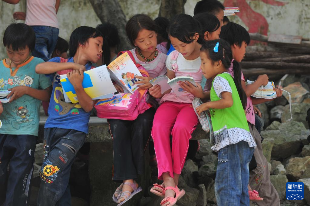在廣西大化瑤族自治縣板升鄉弄雷小學,11歲的蒙秋艷(右二)在校園里學習(2012年9月5日攝)。