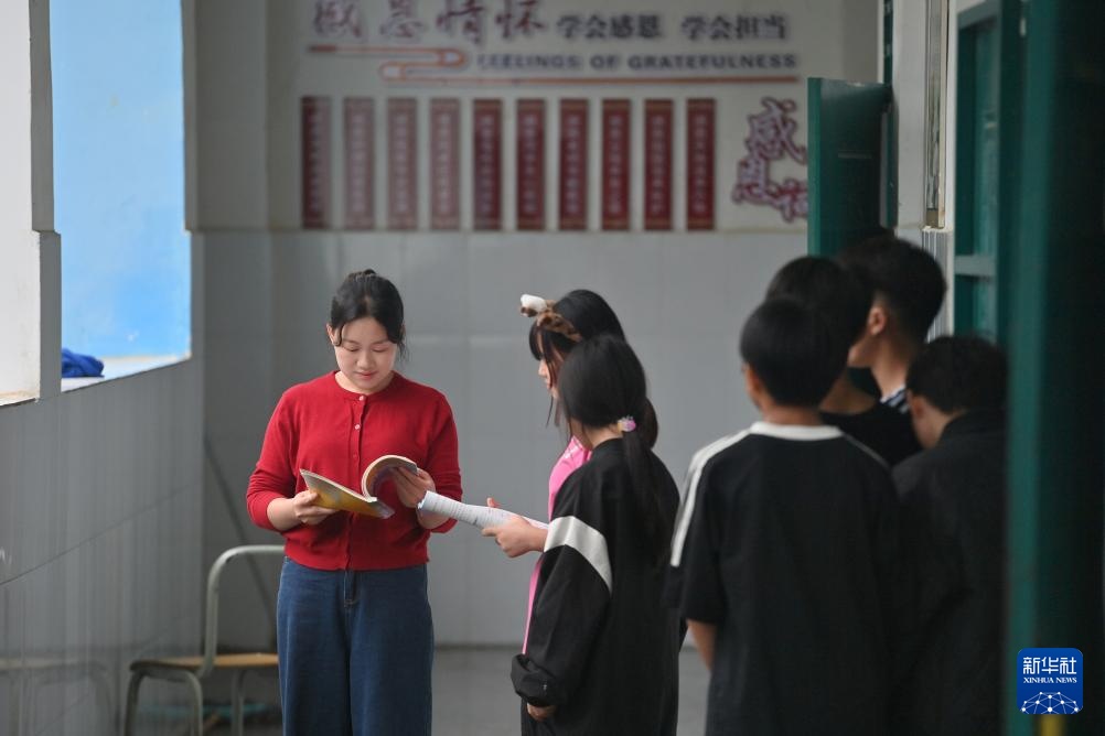 在廣西大化瑤族自治縣板升鄉初級中學,蒙秋艷(左二)為學生輔導學習(2025年5月27日攝)。