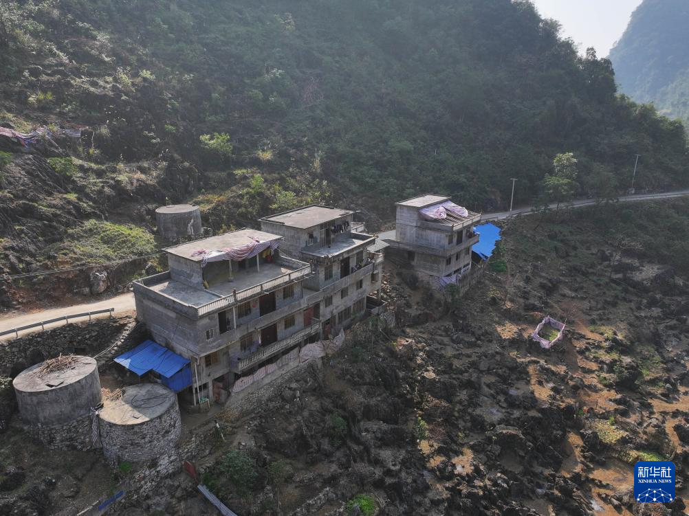 在廣西大化瑤族自治縣板升鄉弄雷村哈寶屯,蒙秋艷的家(左一)已經搬遷至公路邊(無人機照片,2025年1月20日攝)。