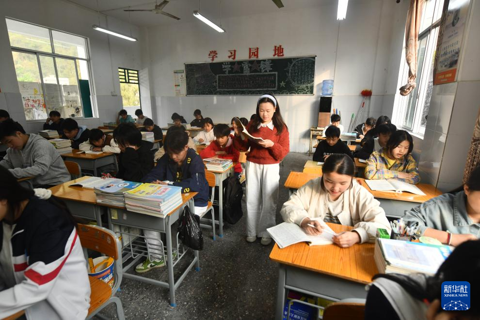在廣西大化瑤族自治縣板升鄉初級中學,蒙秋艷給學生上課(2025年4月2日攝)。