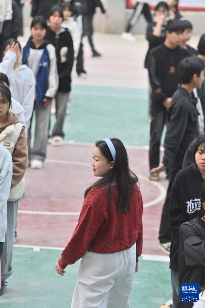 在廣西大化瑤族自治縣板升鄉初級中學大課間,蒙秋艷指導學生開展體育活動(2025年4月2日攝)。