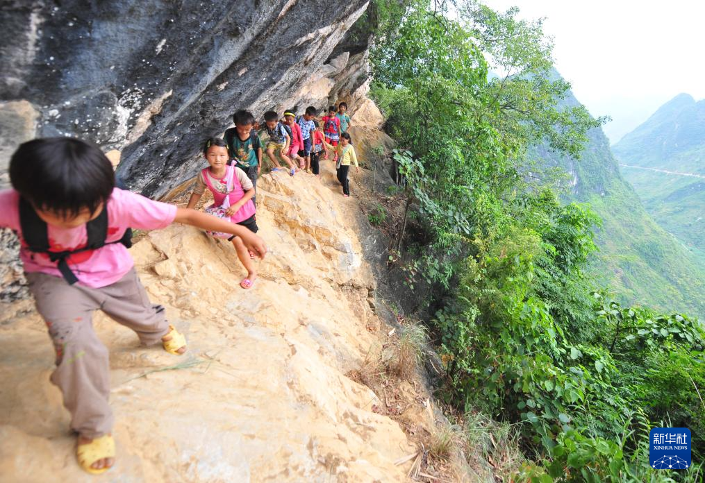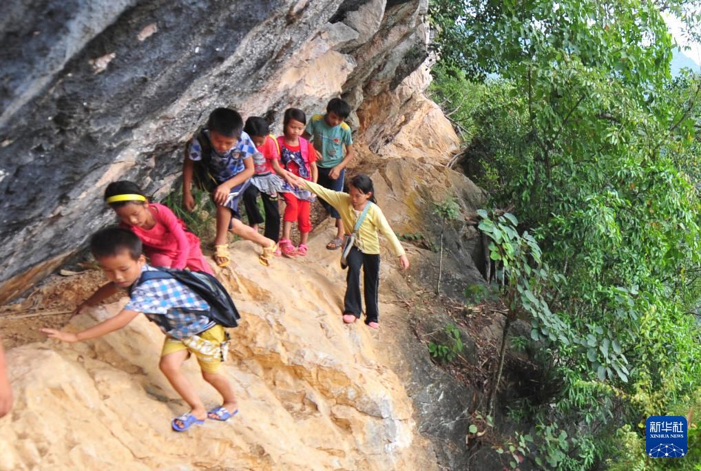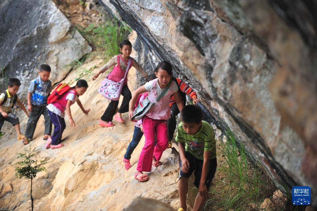 在廣西大化瑤族自治縣板升鄉弄雷村哈寶屯,11歲的蒙秋艷(右二)攀爬懸崖去上學(2012年9月5日攝)。