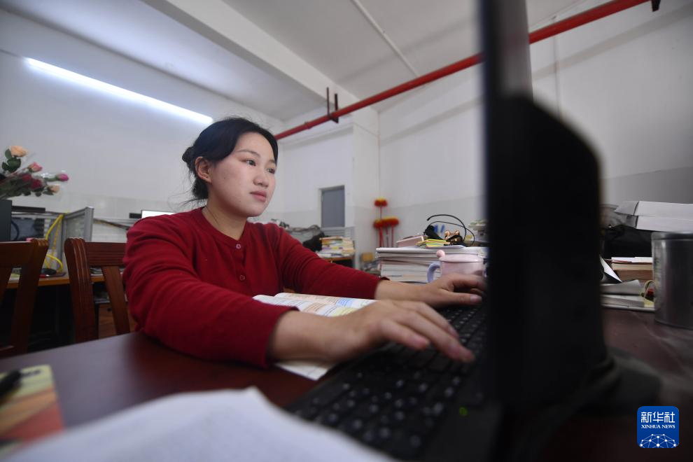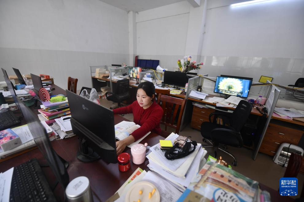 蒙秋艷在廣西大化瑤族自治縣板升鄉初級中學的辦公室里備課(2025年5月27日攝)。