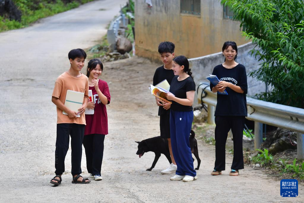 在廣西大化瑤族自治縣板升鄉弄雷村哈寶屯,放假回家的蒙秋艷(右二)和小伙伴們一起交流(2022年8月23日攝)。