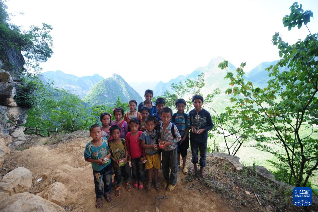 廣西大化瑤族自治縣板升鄉弄雷村哈寶屯,12歲的蒙秋艷(后排左三)和小伙伴們在懸崖邊合影(2013年5月28日攝)。