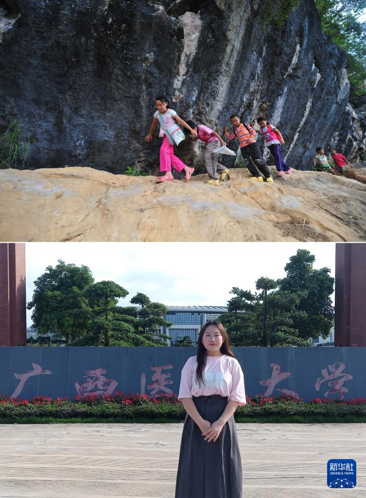 拼版照片:上圖為2012年9月5日,在廣西大化瑤族自治縣板升鄉弄雷村哈寶屯,11歲的蒙秋艷(左一)攀爬懸崖回家;下圖為2023年5月27日,22歲的蒙秋艷站在她就讀的廣西醫科大學校門口留影。