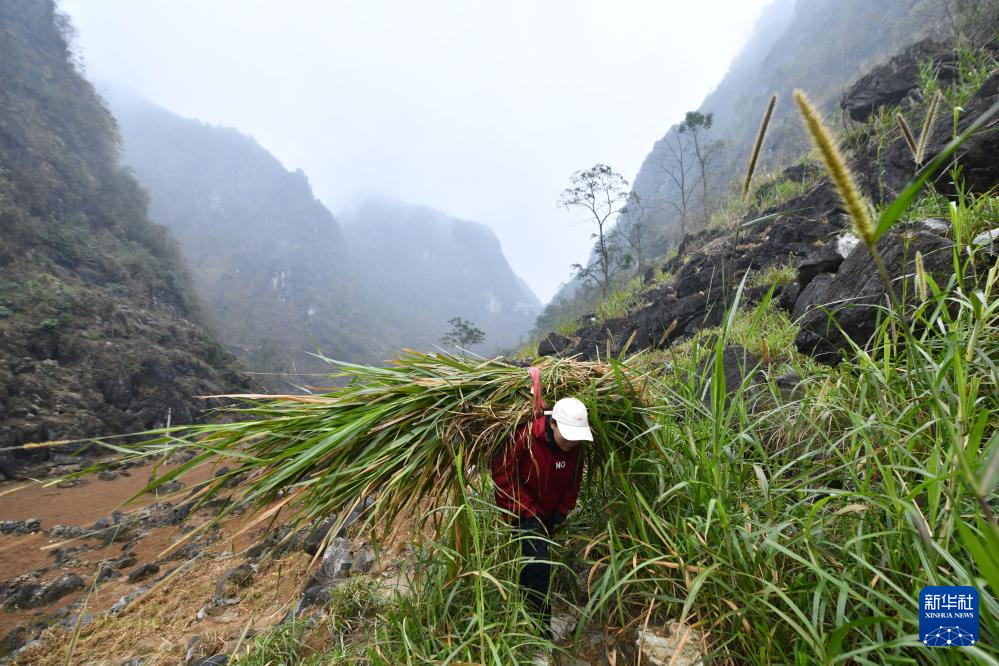 在廣西大化瑤族自治縣板升鄉弄雷村哈寶屯,放假回家的蒙秋艷去田間勞作(2023年1月26日攝)。