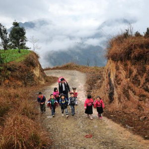 拼版照片。上圖:在廣西龍勝各族自治縣龍脊鎮江柳村,余茂鮮(前右一)和老師同學走在去學校的路上(2013年2月26日攝)。下圖:在桂林信息科技學院,余茂鮮(左二)下課后和同學走在校園里(2025年5月29日攝)。