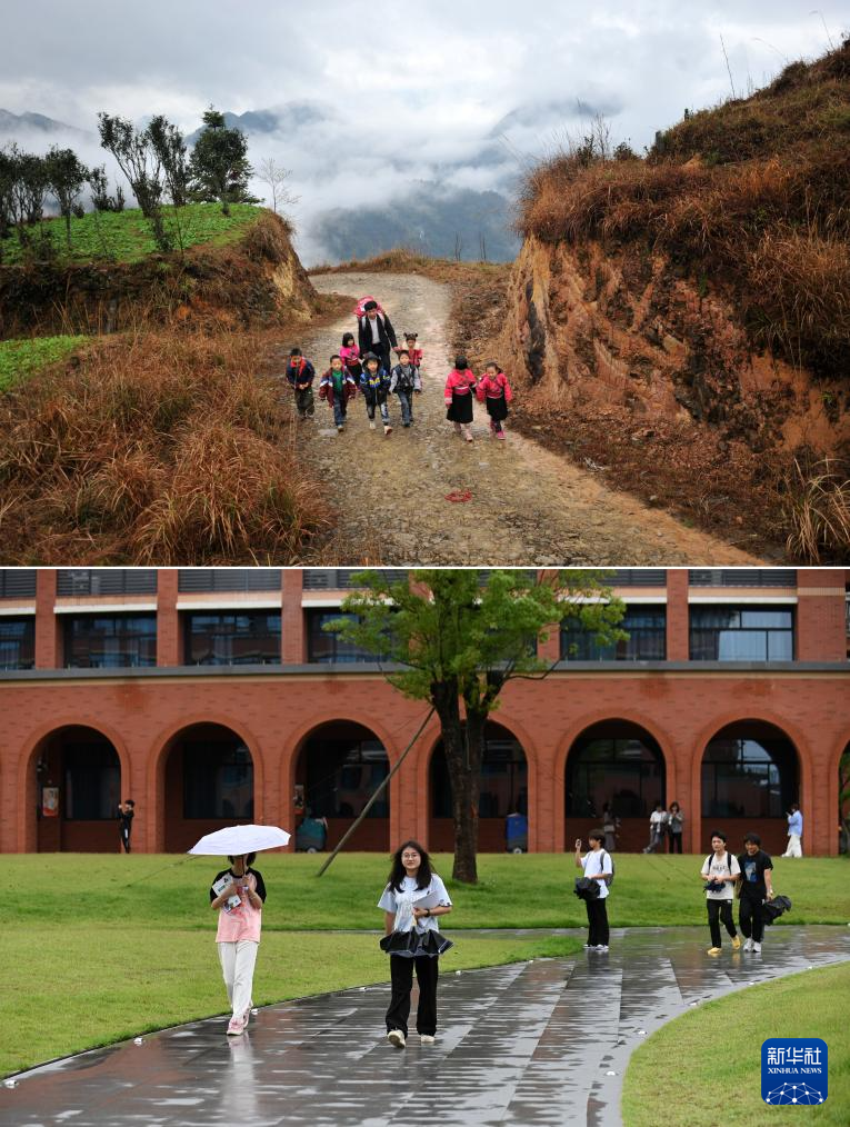 拼版照片。上圖:在廣西龍勝各族自治縣龍脊鎮江柳村,余茂鮮(右三)和老師同學走在去學校的路上(2013年2月26日攝)。下圖:在桂林信息科技學院,余茂鮮(前排左一)和同學在課堂上聽課(2025年5月29日攝)。