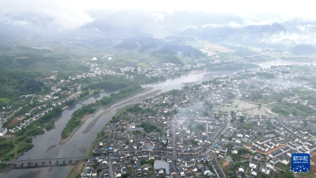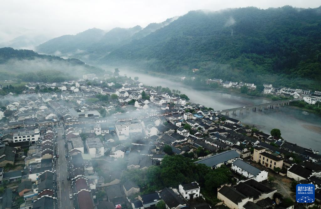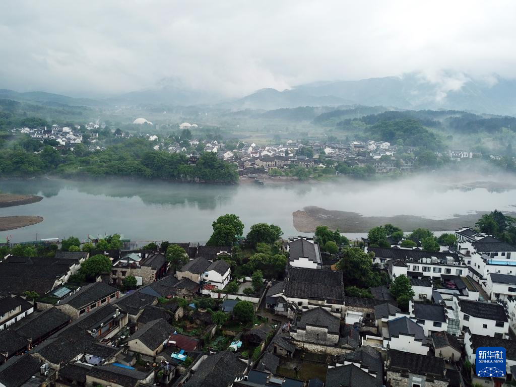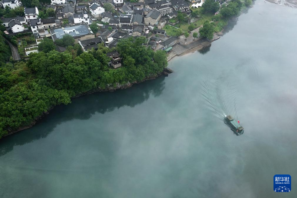 5月16日拍攝的安徽省宣城市涇縣桃花潭鎮雨中晨景(無人機照片)。