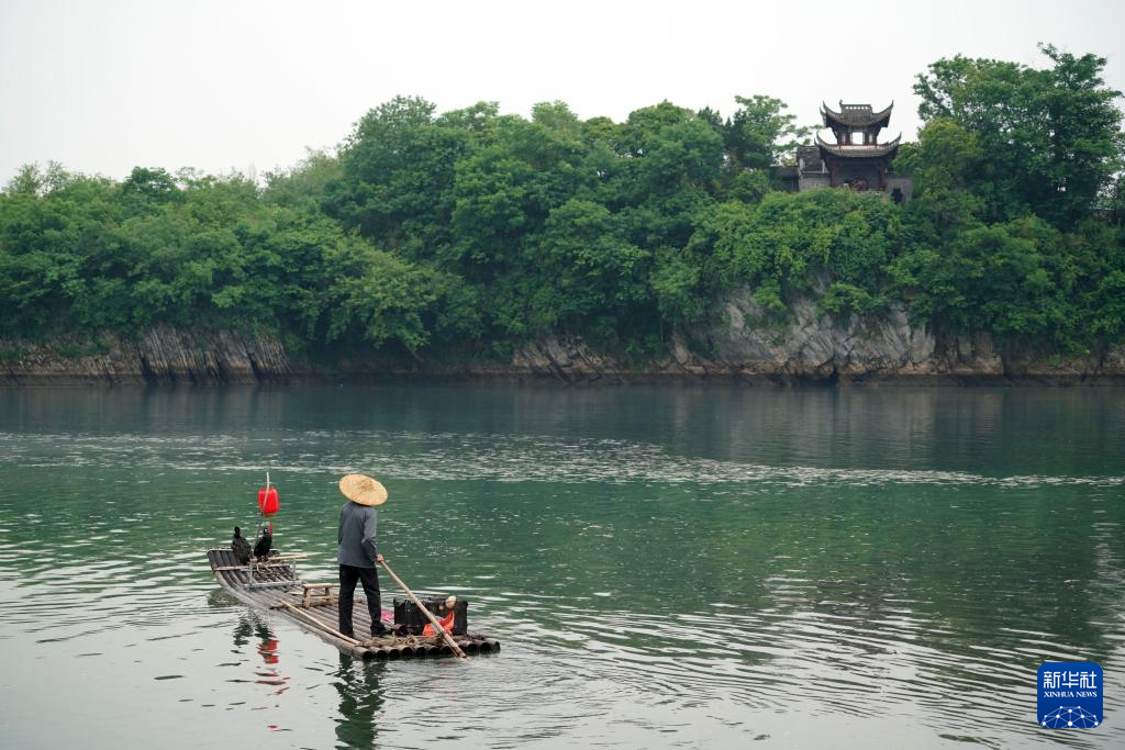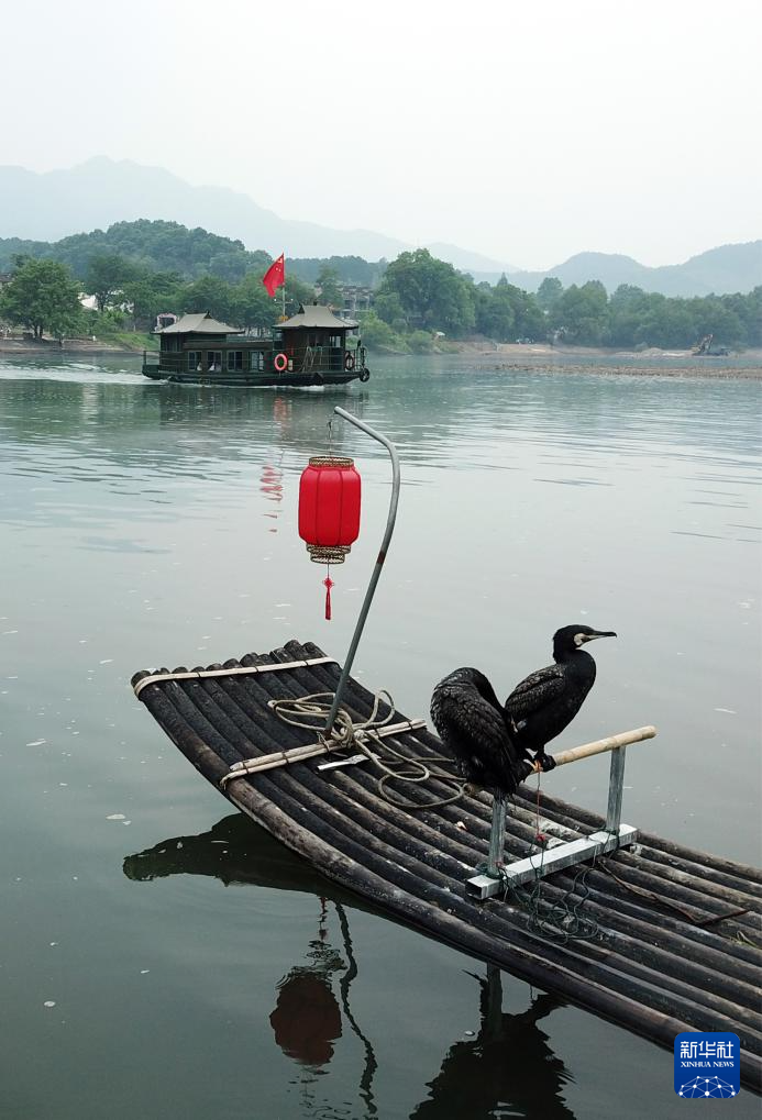5月15日,在安徽省宣城市涇縣桃花潭景區,游客乘船游覽,兩只鸕鶿站在竹筏上(無人機照片)。