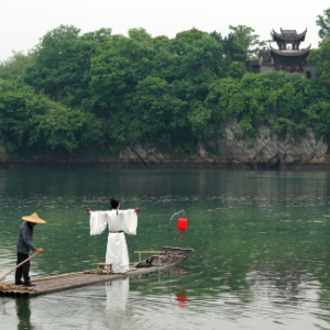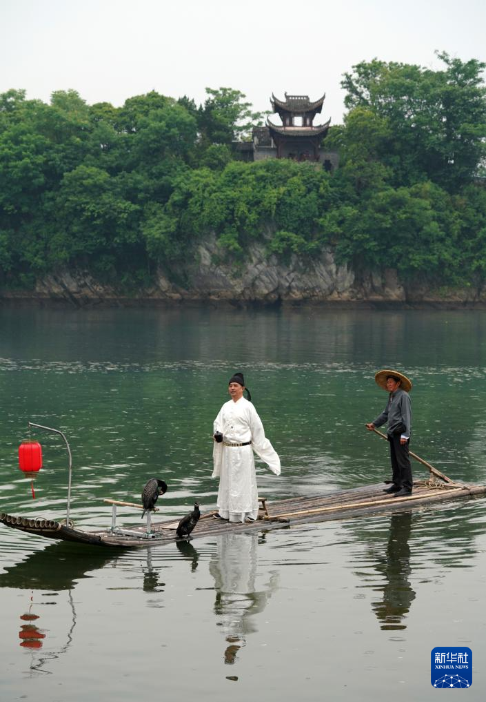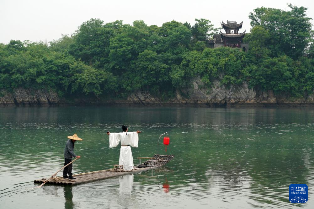 5月15日,在安徽省宣城市涇縣桃花潭景區,一名男子扮演李白乘竹筏賞景。
