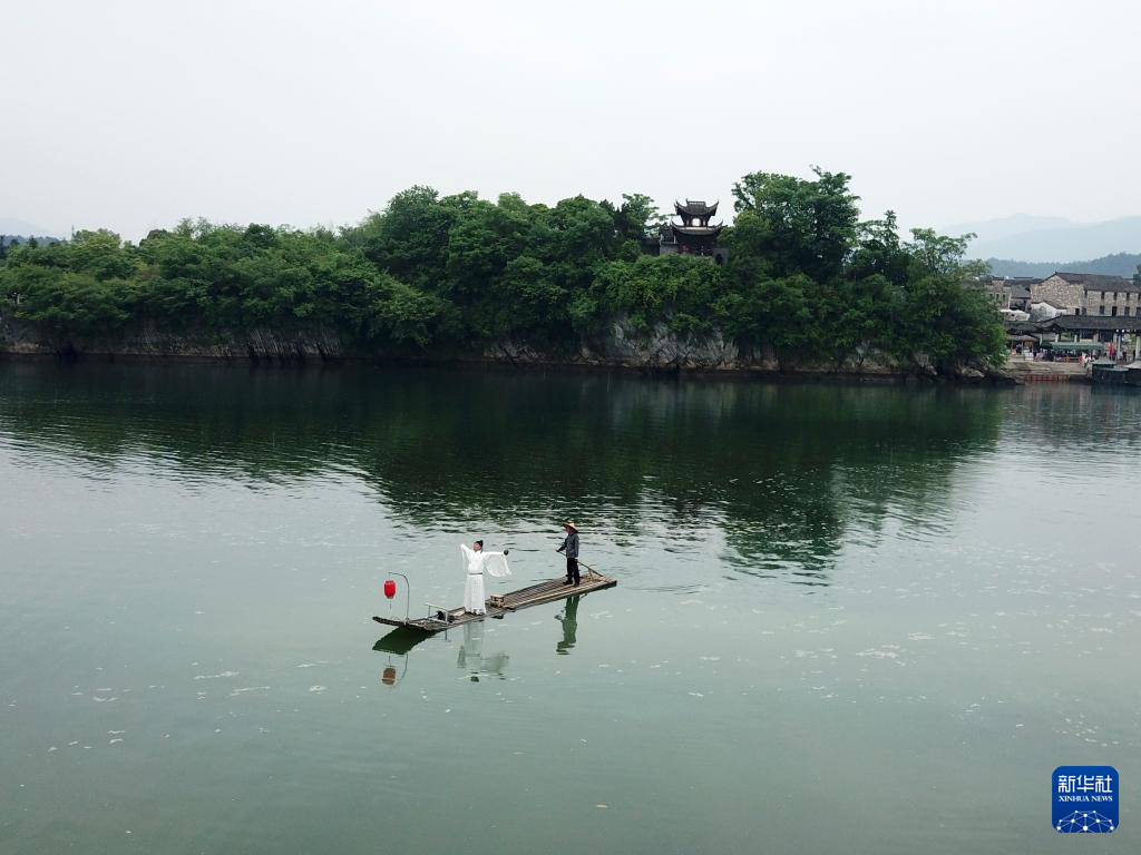 5月15日,在安徽省宣城市涇縣桃花潭景區,一名男子扮演李白乘竹筏賞景(無人機照片)。
