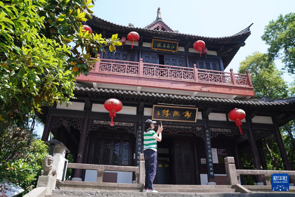 5月14日,游客在安徽省宣城市謝朓樓前拍照。