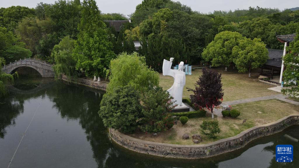 5月13日在安徽省馬鞍山市當涂縣拍攝的李白文化園和園中的李白雕像(無人機照片)。