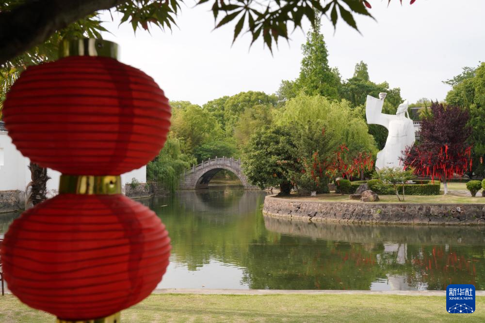 5月13日在安徽省馬鞍山市當涂縣拍攝的李白文化園和園中的李白雕像。