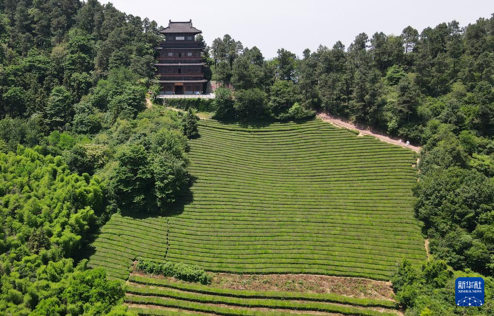 5月14日在安徽省宣城市敬亭山拍攝的太白獨坐樓和茶園風光(無人機照片)。