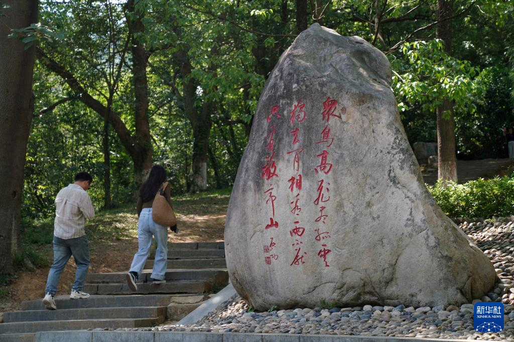 5月14日,游客在安徽省宣城市敬亭山游覽,石碑上刻有李白的《獨坐敬亭山》。