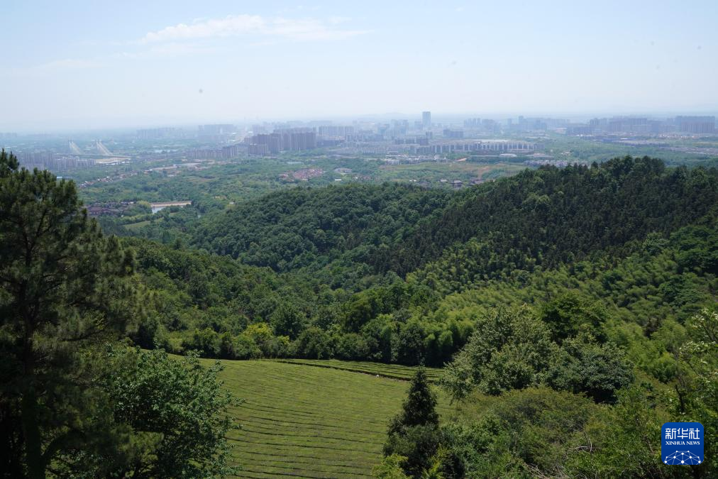 5月14日在安徽省宣城市敬亭山拍攝的茶園和城市景觀。