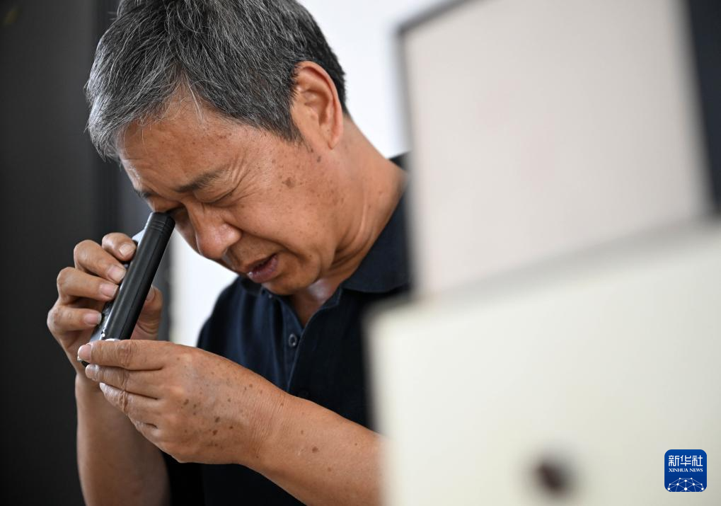 5月28日,汝瓷藝人王國奇在使用放大鏡查看汝瓷殘片釉面。