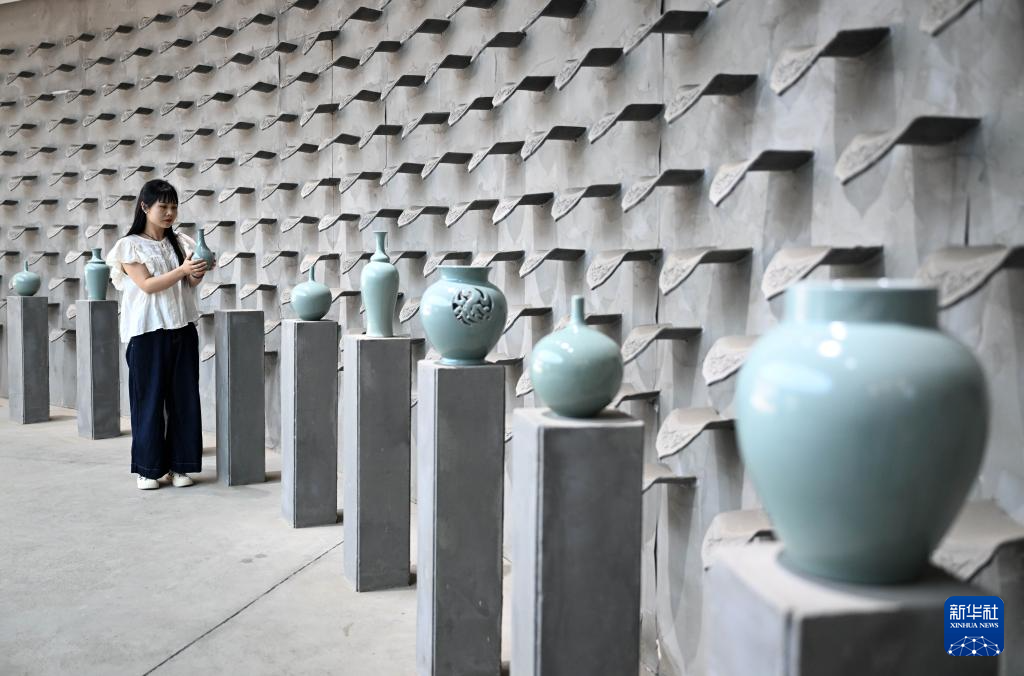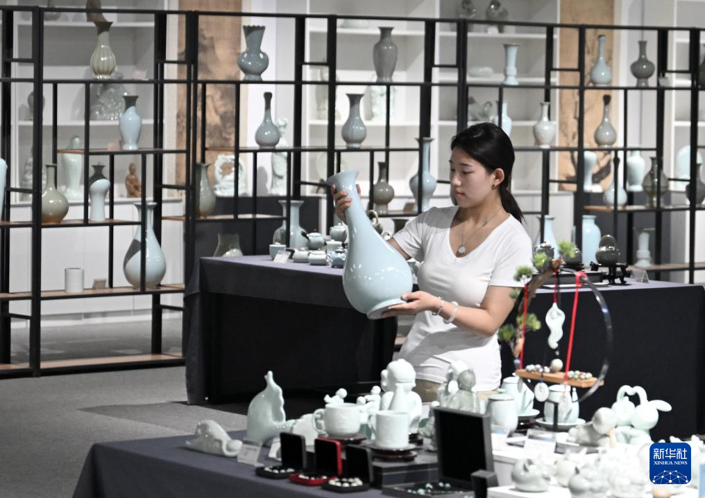 5月29日,寶豐縣一家汝瓷企業的工作人員在整理展廳內的汝瓷產品。