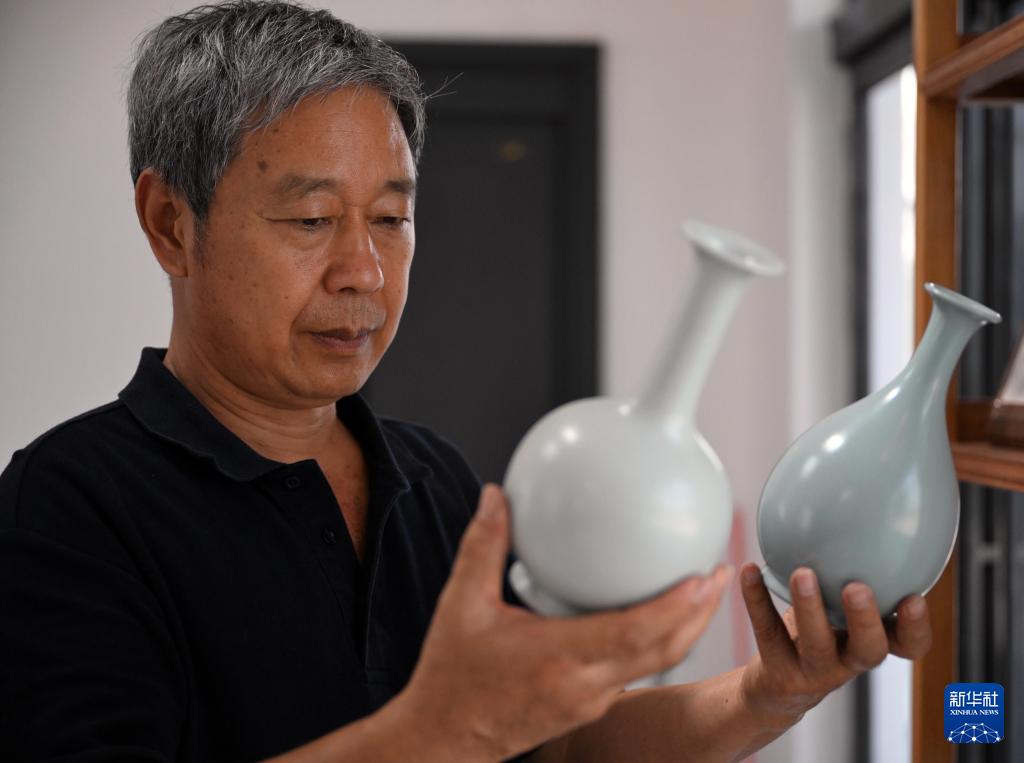 5月28日,汝瓷藝人王國奇在對比汝瓷釉色。
