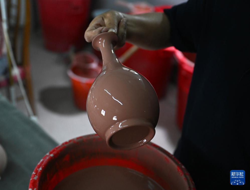 5月28日,汝瓷藝人王國奇在施釉。