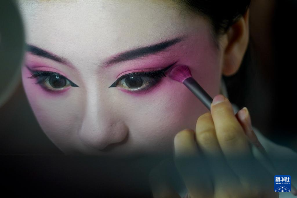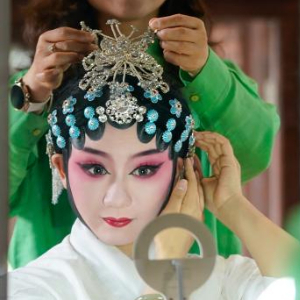在建湖淮劇小鎮,建湖縣淮劇團青年演員夏榮在化妝(6月7日攝)。