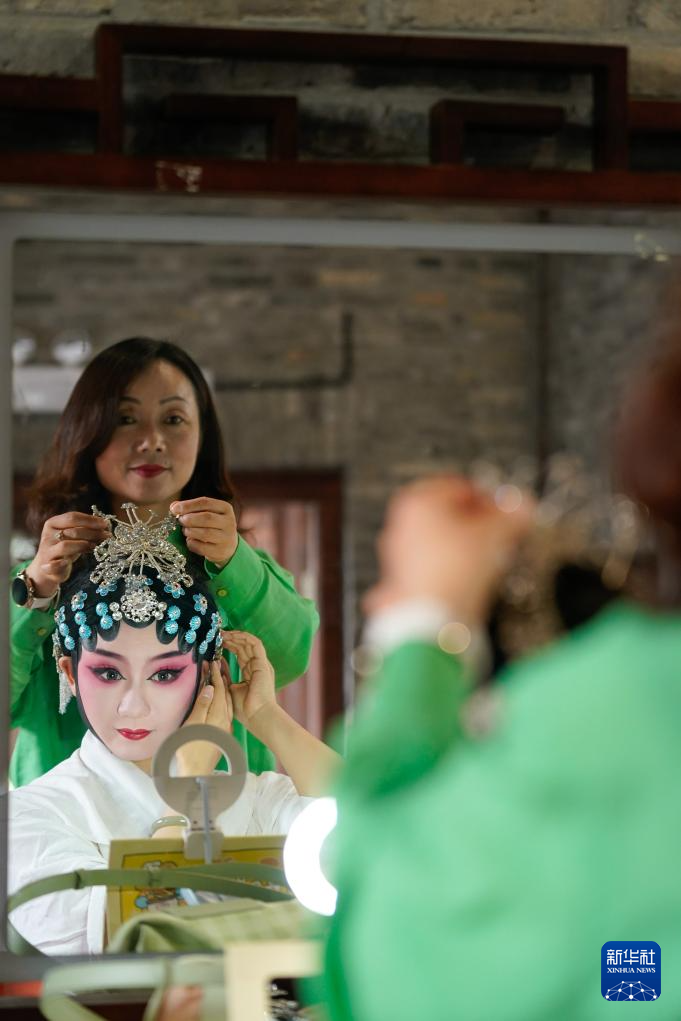 建湖縣淮劇團演員吳滿淦幫青年演員夏榮整理頭飾(6月7日攝)。