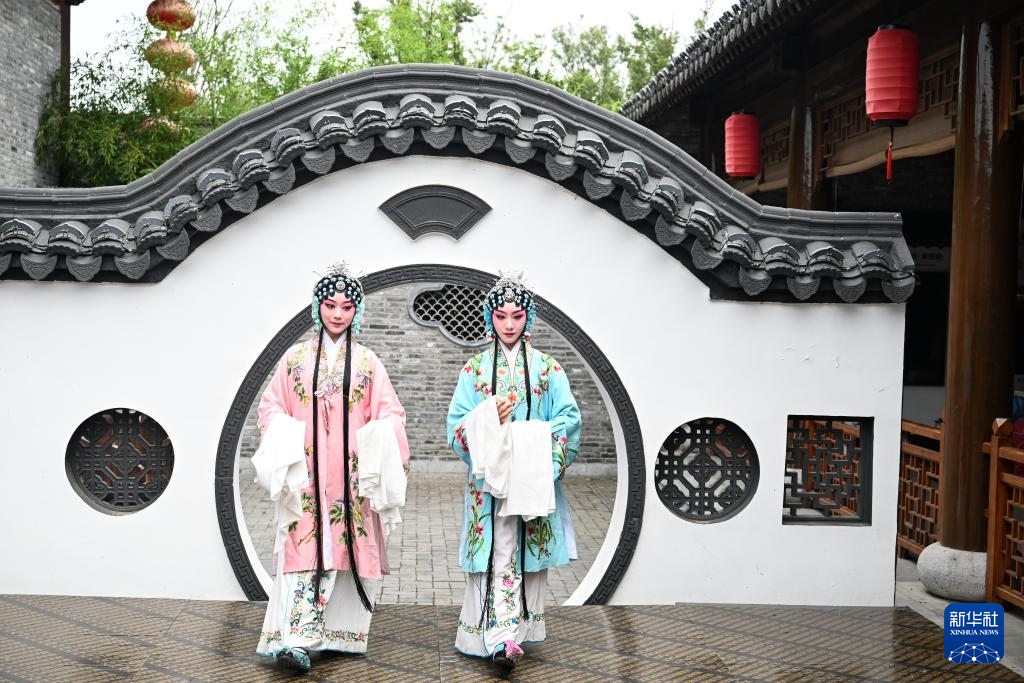 6月7日,建湖縣淮劇團演員夏詩雅(左)、夏榮在淮劇小鎮。
