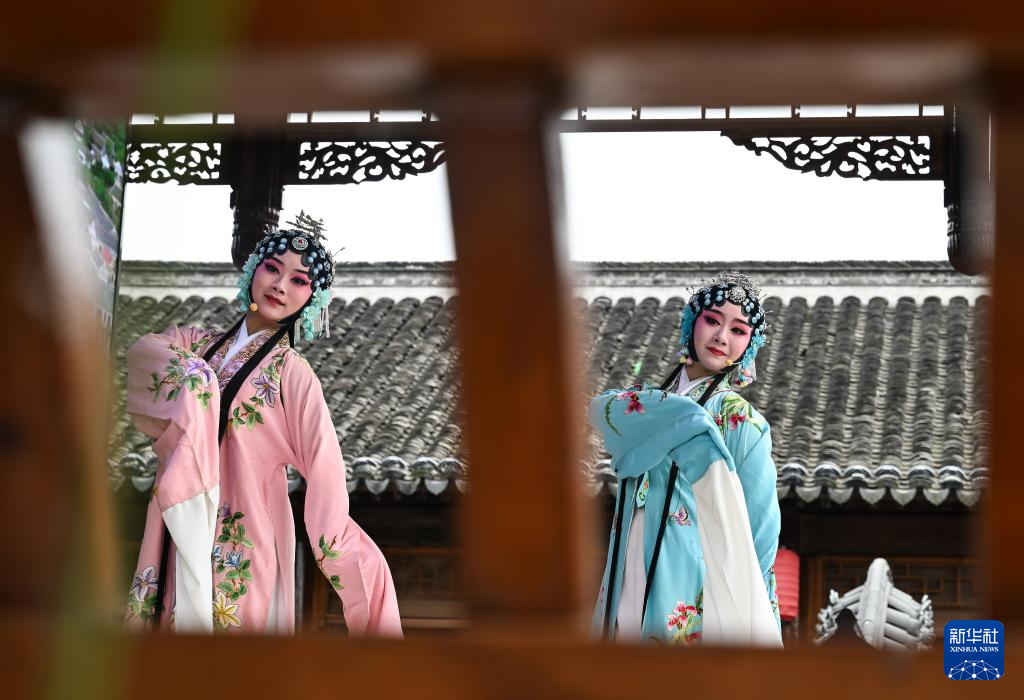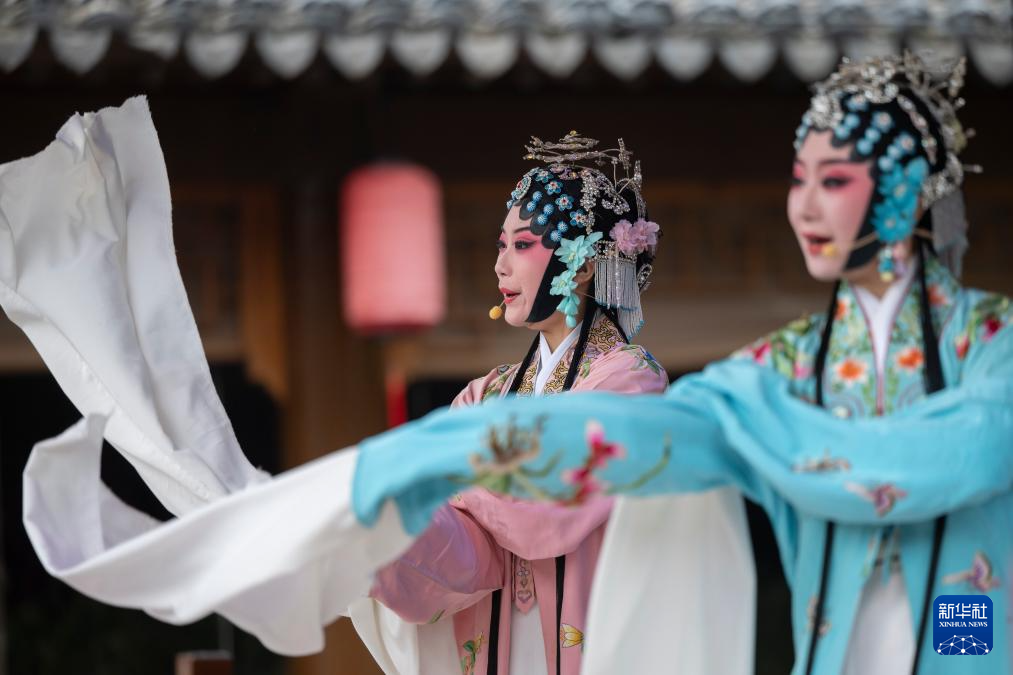 在江蘇省鹽城市建湖縣淮劇小鎮,演員在現場演唱淮?。?月7日攝)。