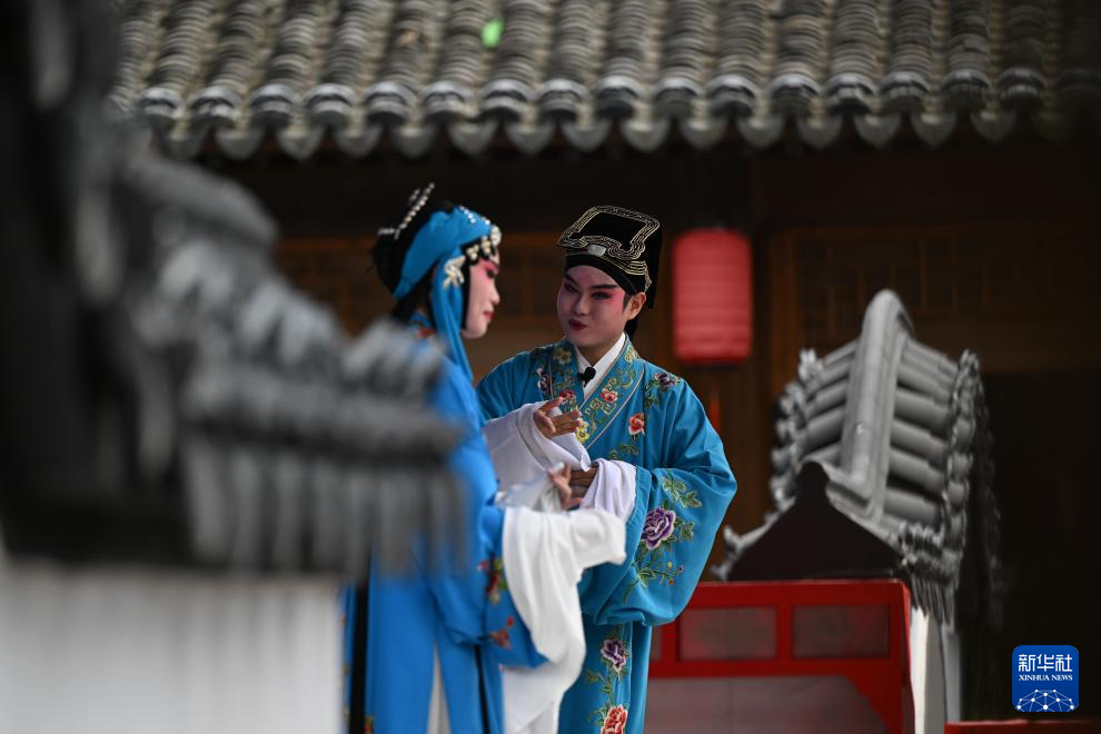 6月7日,演員祁歡和王威(右)在淮劇小鎮表演淮劇。